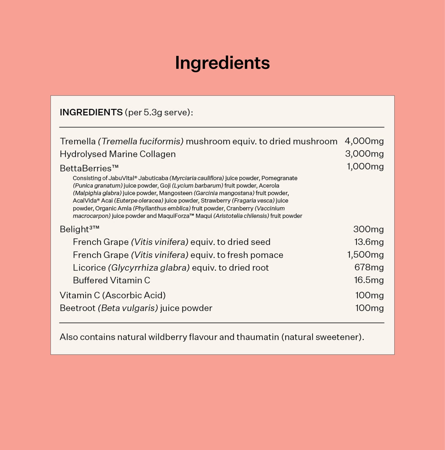 Tremella Mushroom and Marine Collagen work synergistically to trap and retain moisture within the skin, as well as build strong collagen networks, to achieve maximum hydration and elasticity. With plant nutrients from Berries, French Grape and Beetroot to help nourish the skin barrier, resulting in smooth, plump and youthful skin.
