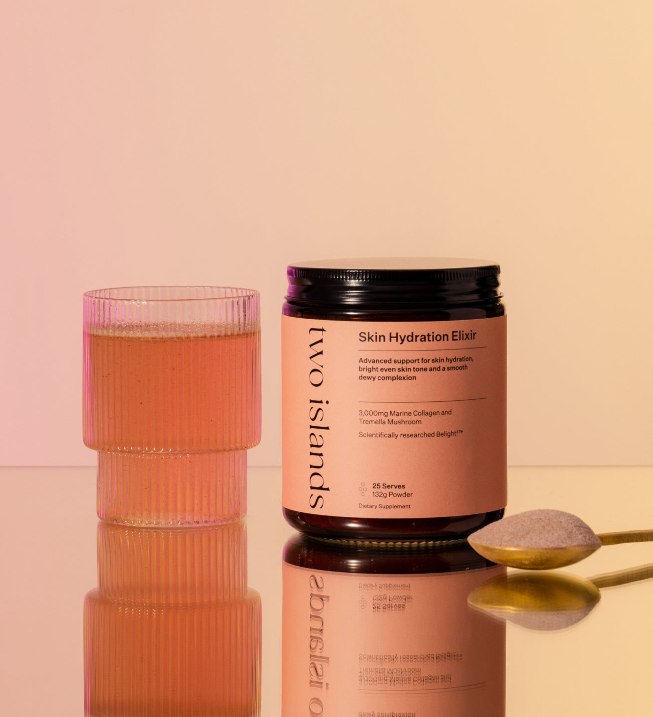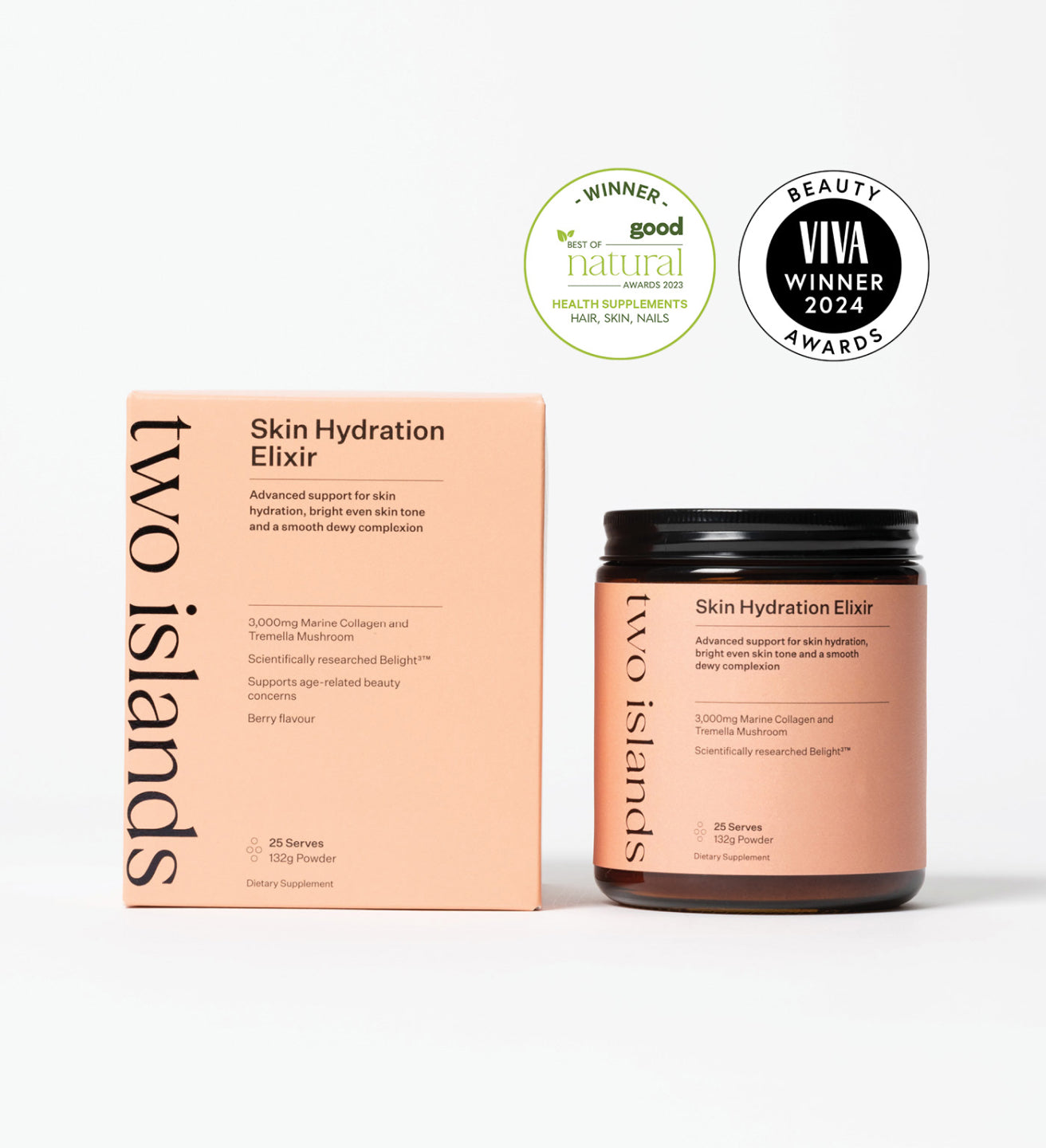 Two Islands Skin Hydration Elixir has been carefully formulated with scientifically researched ingredients to support skin hydration, skin elasticity and hyperpigmentation. Ultra-hydrating Tremella Mushroom and Marine Collagen retain moisture to support plump, dewy and hydrated skin, alongside BettaBerries™ and Beetroot juice which provide antioxidant support for cellular protection and a brighter complexion. Scientifically researched under dermatological control, patented ingredient Belight3™ is unique to Skin Hydration Elixir, working to even skin tone, as well as reduce hyperpigmentation, dark spots, and pregnancy mask, with visible results seen in as little as 10 days. This synergistic blend of ingredients in Skin Hydration Elixir ultimately adds radiance, hydration and glow to your everyday complexion while evening skin tone.