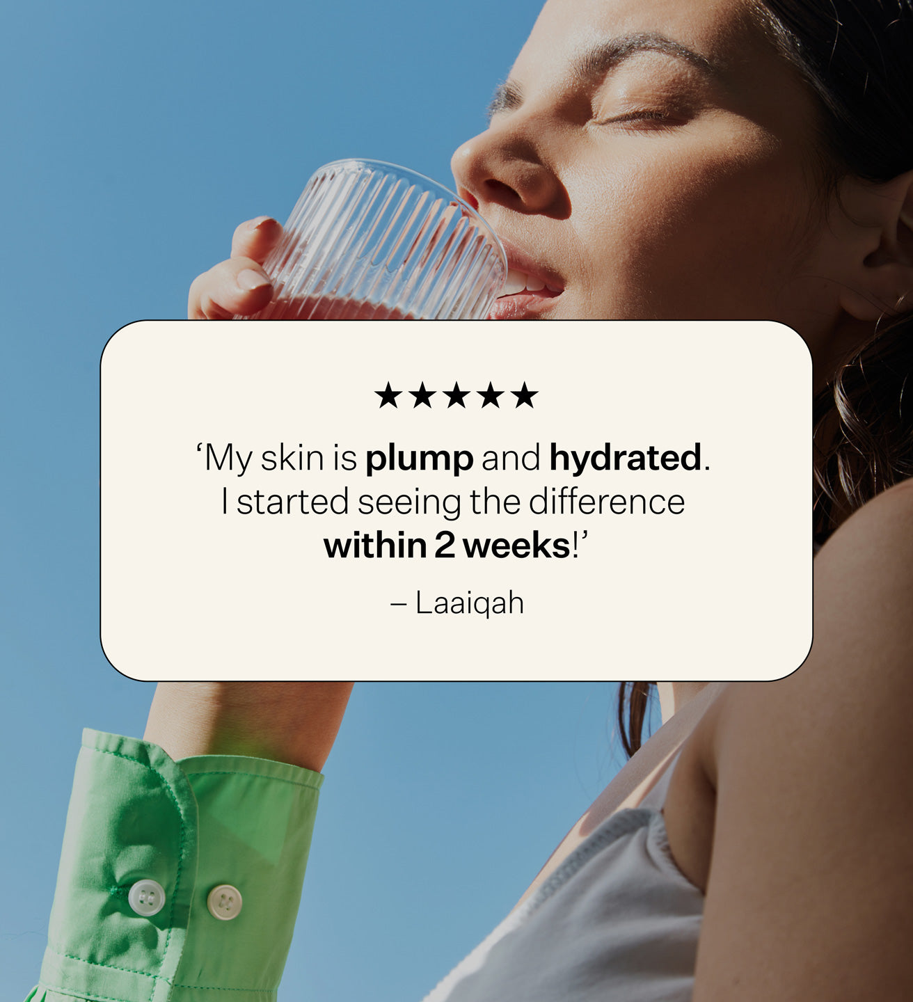 A type of sugar molecule naturally found within our skin that helps it to retain moisture. Research has shown that supplementation of hyaluronic acid can improve skin dryness, hydration and reduce the appearance of fine lines, making it the perfect ingredient to support plump and supple skin from the inside out.
