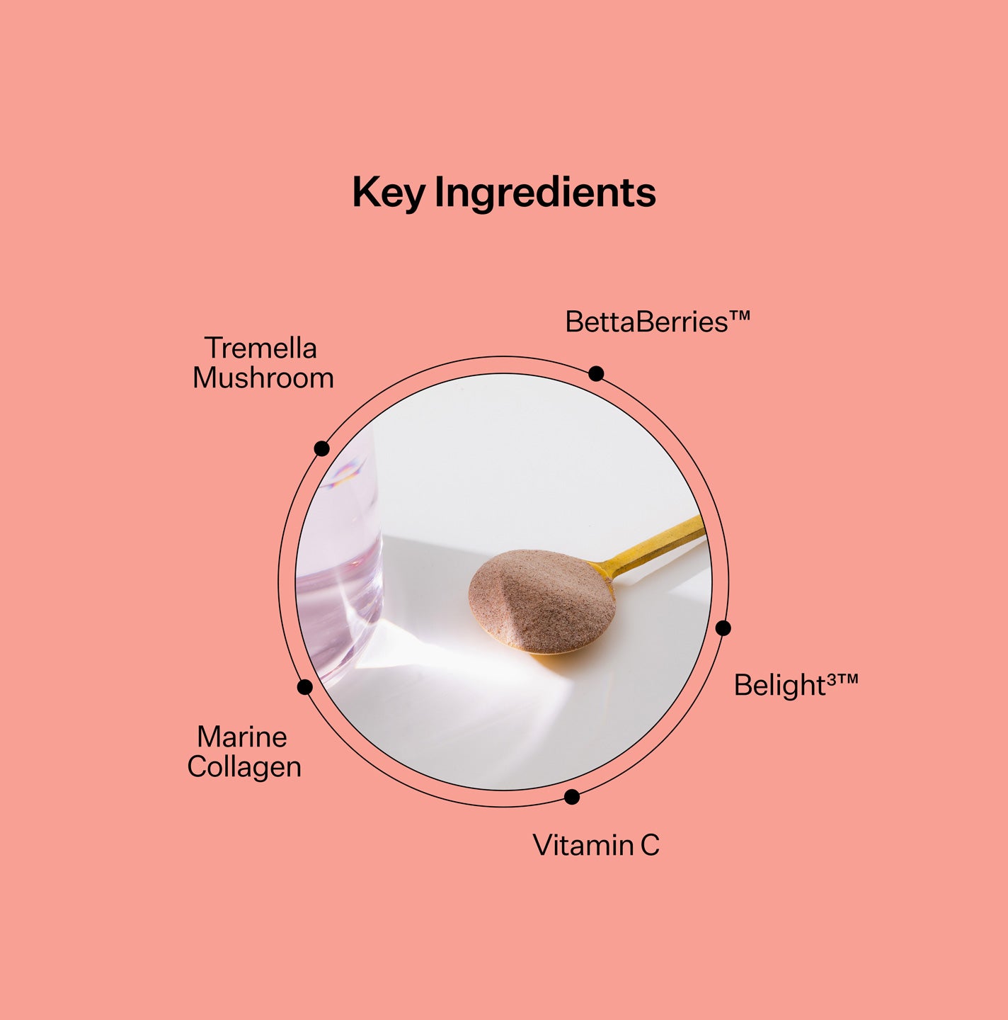 With a synergistic blend of potent berry antioxidants, hydrating Tremella Mushroom, Marine Collagen, anthocyanin-rich beetroot juice powder, Vitamin C and French Grape Seed polyphenols, Skin Hydration Elixir is a beauty supplement designed to advance your skincare routine. Tremella Mushroom and Marine Collagen hydrate the skin to restore plumpness and elasticity, while antioxidants from berries and grape polyphenols work to brighten skin complexion and provide cellular protection.