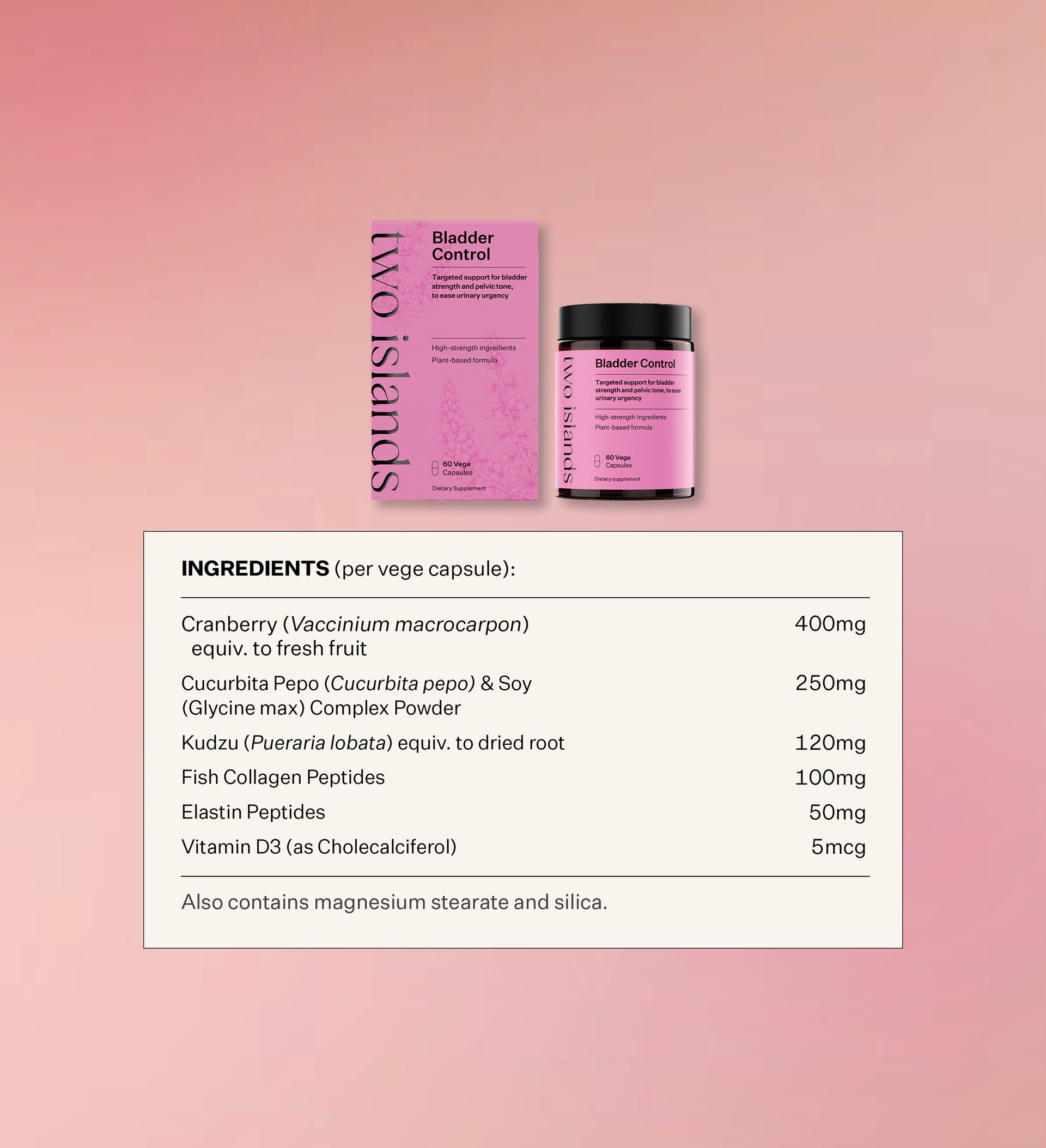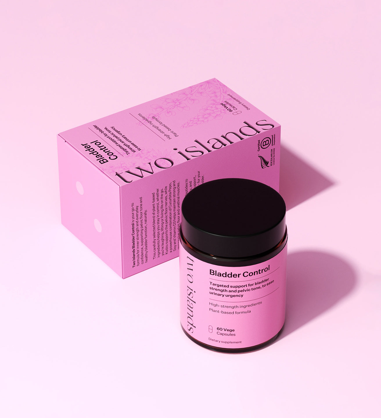 See more FAQ’sIf you experience leaks, urgency, or simply want to strengthen your pelvic floor and support urinary health, Bladder Control is a convenient and effective addition to your daily wellness routine. The carefully selected blend of Kudzu Root, Cucurbita Pepo & Soy Complex, Collagen and Elastin Peptides, Cranberry and Vitamin D3 work to support muscle tone, elasticity, nerve function and urinary tract health - helping you feel more confident, comfortable and in control every day.