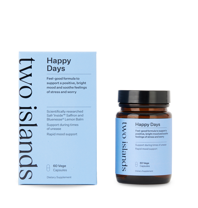 The ingredients in Happy Days work synergistically to provide mood support, stress relief and nervous system support. Happy Days can help to lower levels of cortisol (our body’s stress hormone) that is produced by our adrenal glands, to help reduce that uneasy ‘fight or flight’ sensation which can take a toll on our body, as well as calm the nervous system. Lemon Balm and Saffron also promote levels of mood-boosting neurotransmitters including GABA, serotonin and dopamine to improve mood. Taking Happy Days can therefore help to reduce feelings of stress and anxiety and promote calmness, with the herbal and adaptogenic formula of clinically researched Bluennesse® Lemon Balm, Safr’Inside™ Saffron, AshwaMind® Ashwaghanda and L-theanine – all of which have been clinically shown to reduce feelings of anxiety and/or depression.