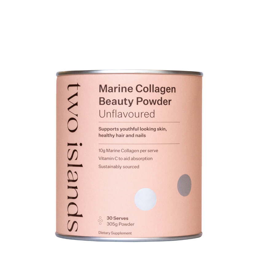 Two Islands Marine Collagen Beauty Powder contains sustainably sourced hydrolysed Marine Collagen peptides plus Vitamin C. These collagen peptides have the ability to travel through the bloodstream to various parts of the body, including the dermis – the deepest layer of our skin – and support skin hydration, elasticity and reduce the signs of aging.