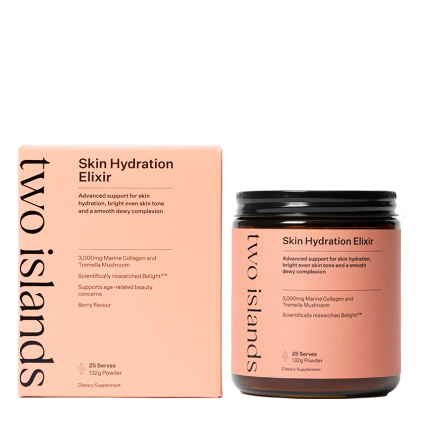 Two Islands Skin Hydration Elixir has been carefully formulated with scientifically researched ingredients to support skin hydration, skin elasticity and hyperpigmentation. Ultra-hydrating Tremella Mushroom and Marine Collagen retain moisture to support plump, dewy and hydrated skin, alongside BettaBerries™ and Beetroot juice which provide antioxidant support for cellular protection and a brighter complexion. Scientifically researched under dermatological control, patented ingredient Belight³™ is unique to Skin Hydration Elixir, working to even skin tone, as well as reduce hyperpigmentation, dark spots, and pregnancy mask, with visible results seen in as little as 10 days. This synergistic blend of ingredients in Skin Hydration Elixir ultimately adds radiance, hydration and glow to your everyday complexion while evening skin tone.