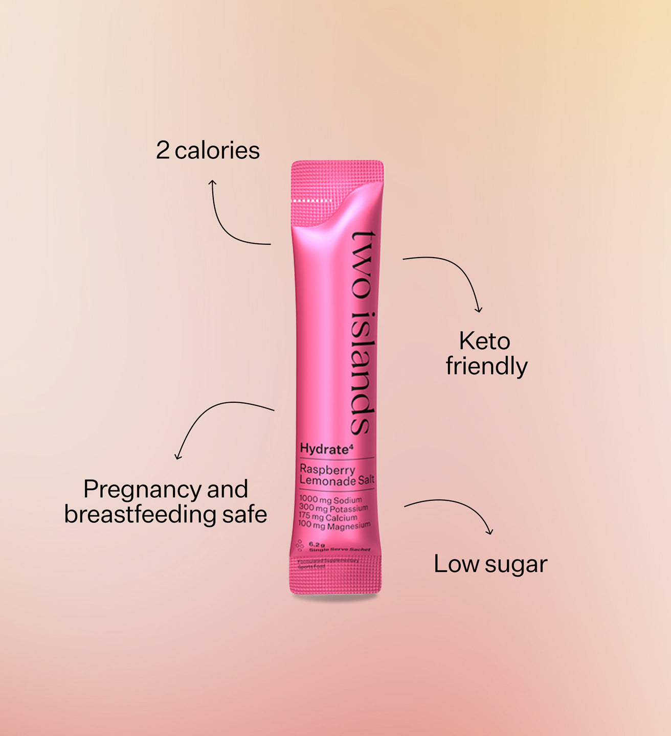 Formulated with four electrolytes, Hydrate⁴ makes hydration deliciously easy for new mums. Ideal for breastfeeding, workouts, busy days or staying active, and available in convenient electrolyte sachets for on-the-go hydration.