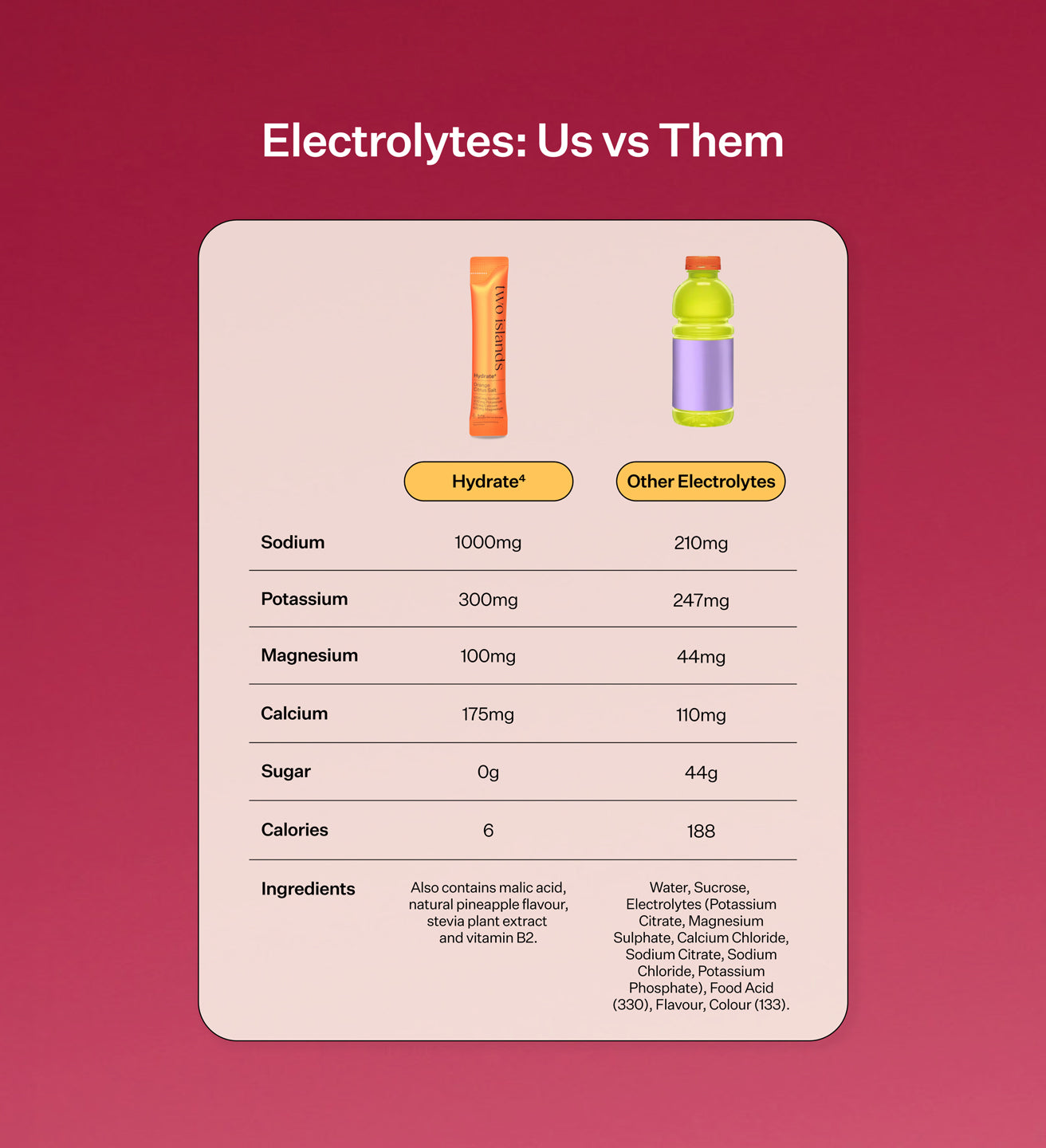 Yes! Hydrate⁴ is suitable to take alongside all other Two Islands products as part of your daily wellness routine. We recommend pairing Hydrate⁴ with our Pea Protein Powders for the ultimate energy and recovery support.