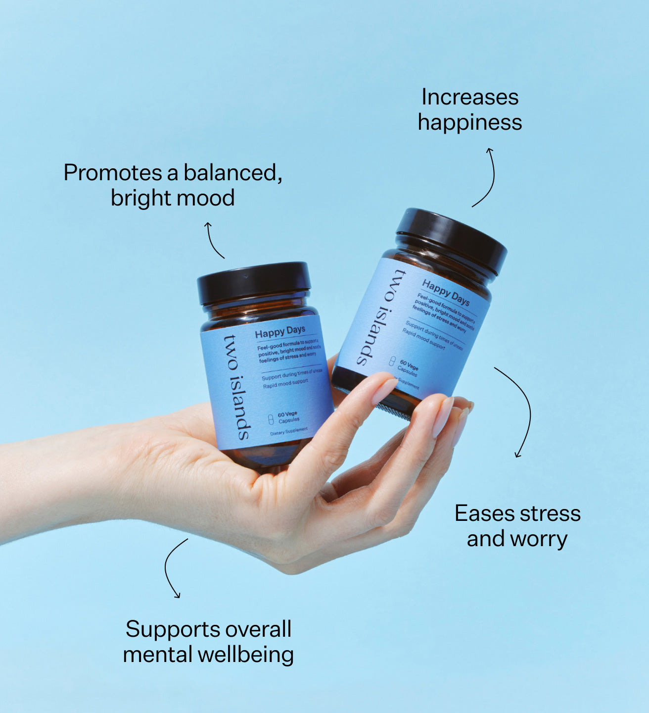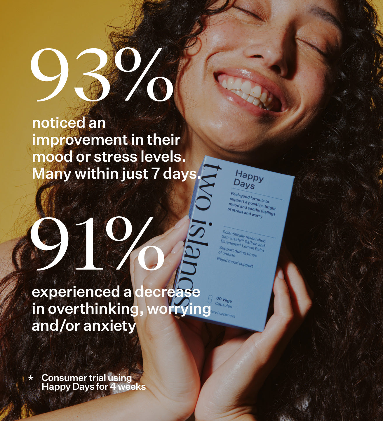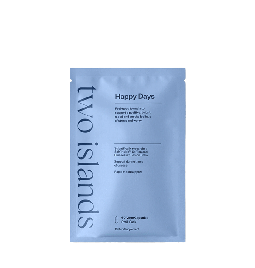 The ingredients in Happy Days work synergistically to provide mood support, stress relief and nervous system support. Happy Days can help to lower levels of cortisol (our body’s stress hormone) that is produced by our adrenal glands, to help reduce that uneasy ‘fight or flight’ sensation which can take a toll on our body, as well as calm the nervous system. Lemon Balm and Saffron also promote levels of mood-boosting neurotransmitters including GABA, serotonin, and dopamine to improve mood. Taking Happy Days can therefore help to reduce feelings of stress and anxiety and promote calmness, with the herbal and adaptogenic formula of clinically researched Bluennesse® Lemon Balm, Safr’Inside™️ Saffron, AshwaMind® Ashwaghanda and L-theanine – all of which have been clinically shown to reduce feelings of anxiety and/or depression.
