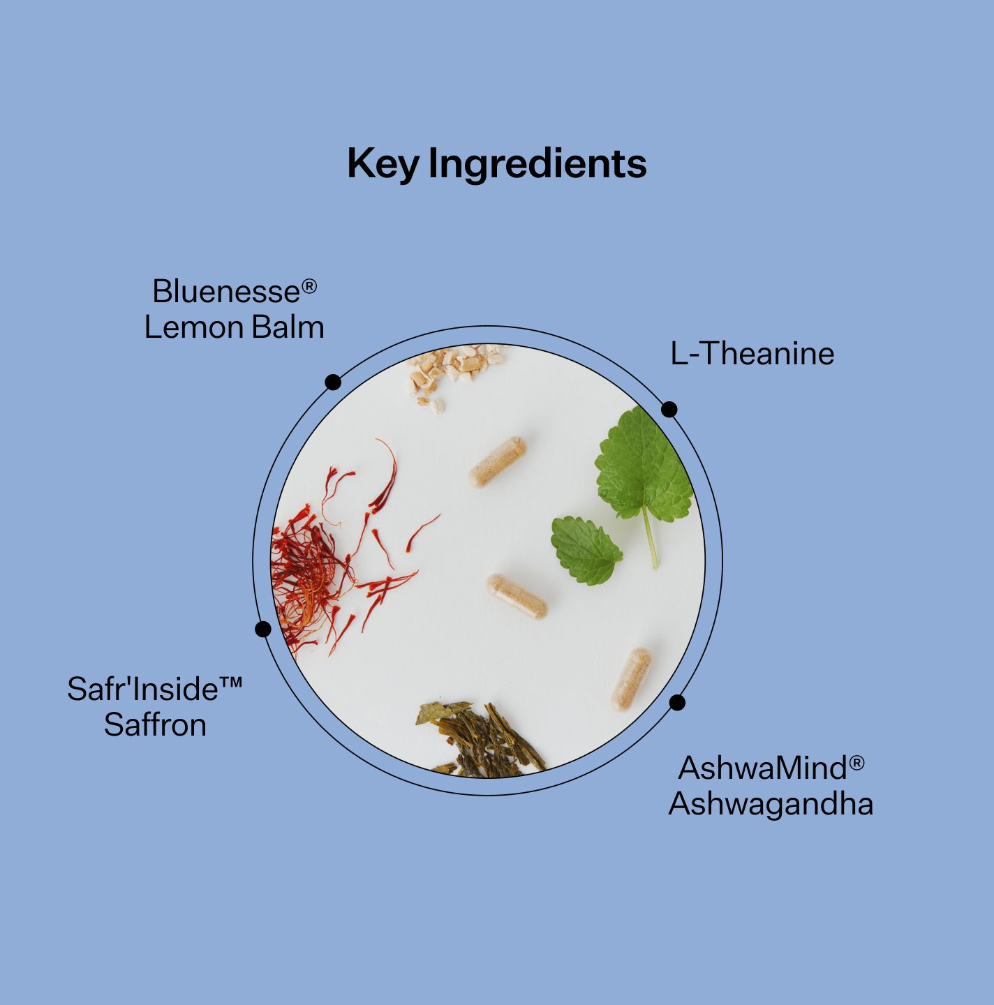 Scientifically researched Bluenesse® Lemon Balm has been shown to start working in as little as 1-3 hours by reducing cortisol levels to rapidly help ease nervous tension, worry and anxiety. It has also been shown to increase levels of GABA and dopamine by preventing their degradation, and rapidly improving mood. Safr’Inside™️ Saffron has also been clinically researched to cause a 60% decrease in overall stress levels, with effects being noticed in as little as 5 days.