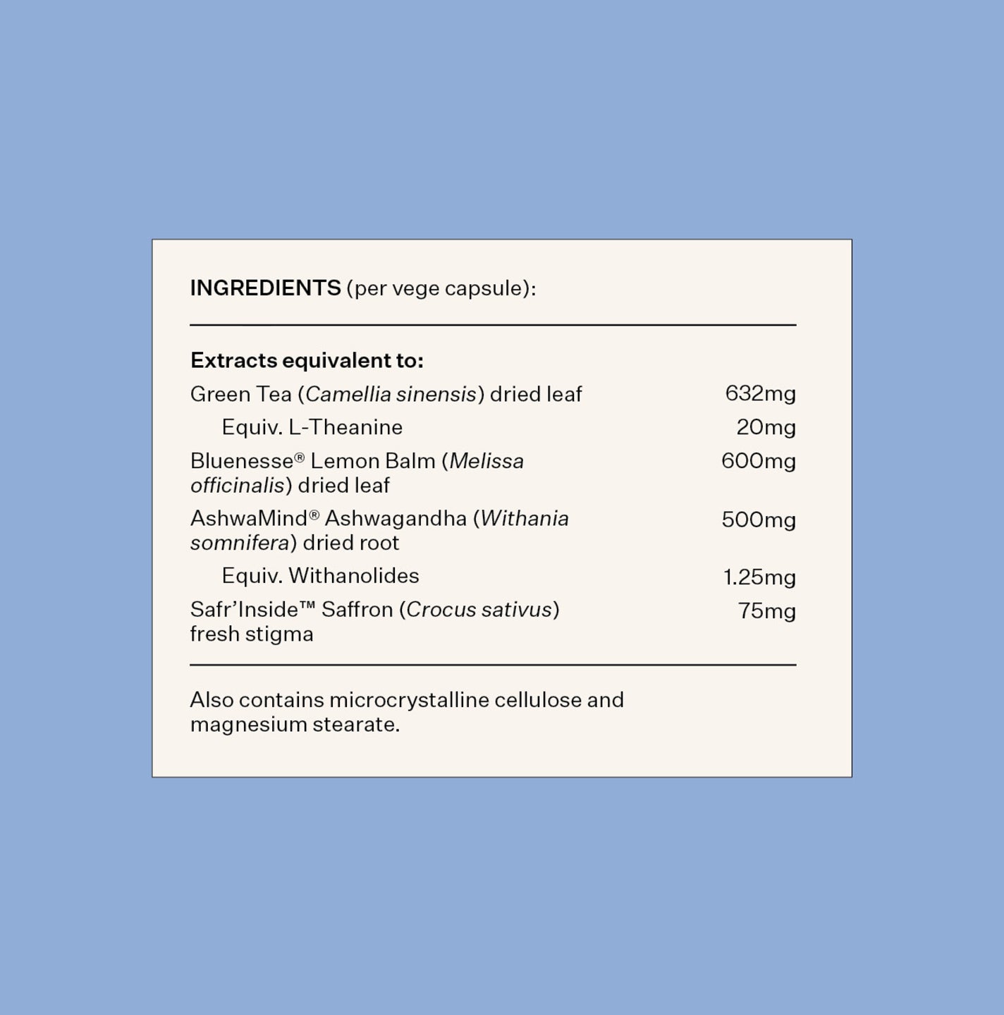 Adaptogenic Ashwagandha helps the body naturally adapt and cope with everyday stress and adrenal fatigue, working alongside Bluenesse® Lemon Balm and L-theanine to lower cortisol levels in the body to overcome feelings of stress and low mood, as well as providing nervous system support by easing nervous tension.