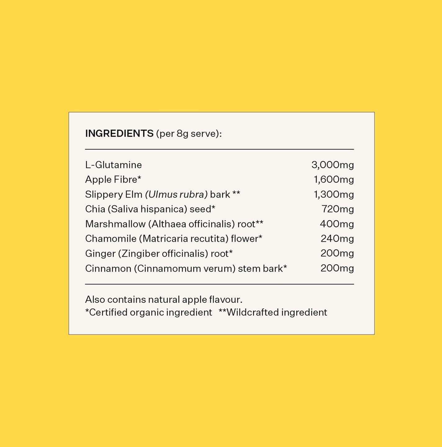 Promotes a healthy and functional gut barrier by maintaining gut lining integrity and intestinal cell turnover, assisted by anti-inflammatory effects of herbs marshmallow and chamomile as well as spices ginger and cinnamon. Soothing slippery elm coats and protects the delicate gut mucosal membrane, while prebiotic apple fibre promotes a balanced microbiome for overall improved gut health.