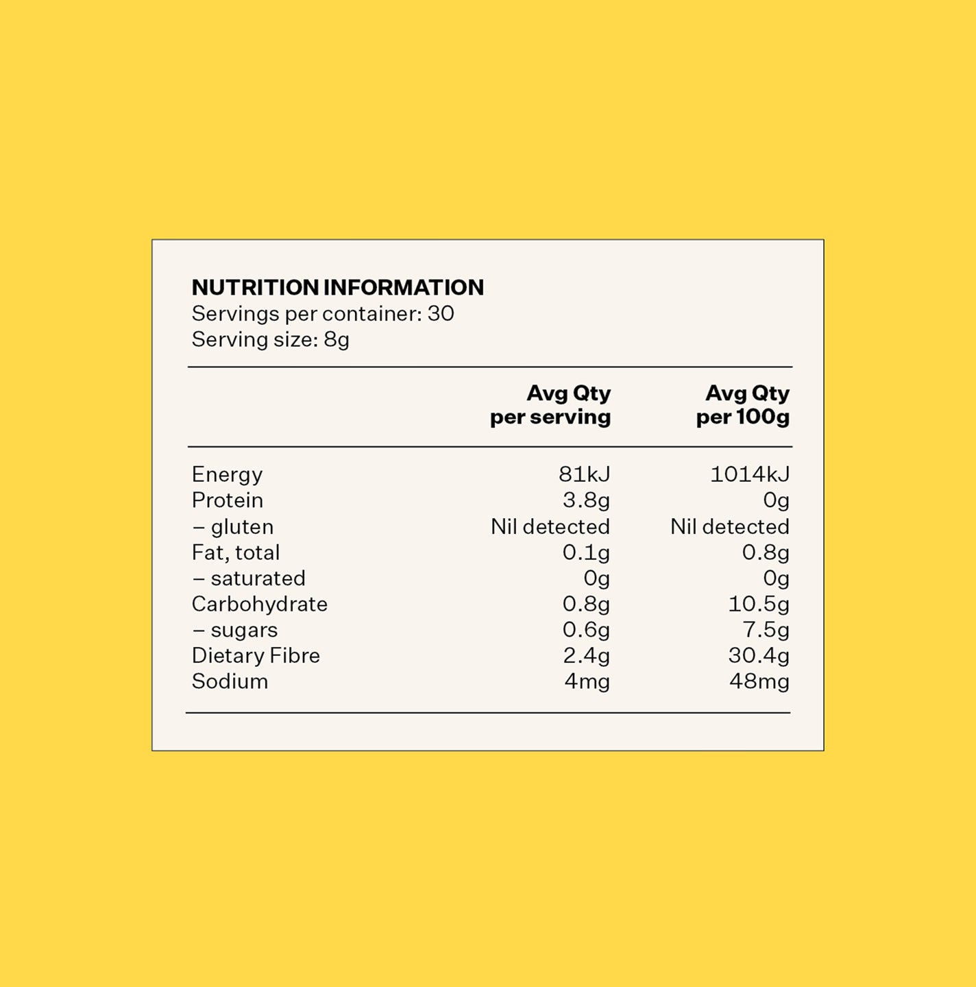 Helps bulk stools and allows for regular and comfortable bowel motions. A good source of prebiotic fibre to support a healthy intestinal microbial balance.