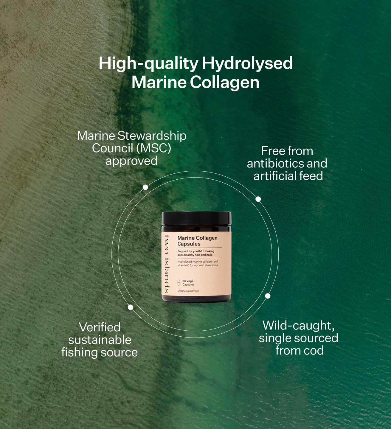 Two Islands Collagen Beauty Powder and Collagen Beauty Capsules contains hydrolysed marine collagen peptides which is derived from fish skin. Because of their small particle size, hydrolysed collagen can reach the small intestine in the form of collagen peptides. Here they are broken down into smaller particles (dipeptides and tripeptides) and free amino acids where they can then be absorbed and distributed throughout the body via the bloodstream.