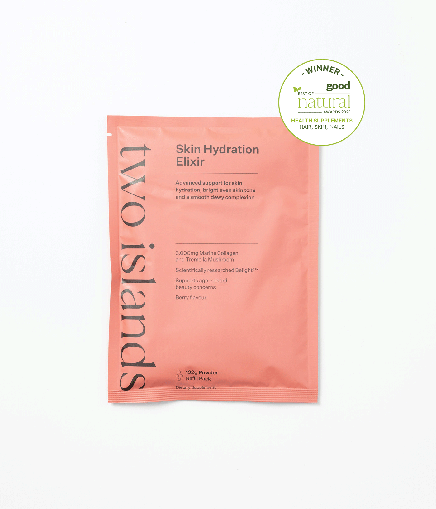 Two Islands Skin Hydration Elixir has been carefully formulated with scientifically researched ingredients to support skin hydration, skin elasticity and hyperpigmentation. Ultra-hydrating Tremella Mushroom and Marine Collagen retain moisture to support plump, dewy and hydrated skin, alongside BettaBerries™ and Beetroot juice which provide antioxidant support for cellular protection and a brighter complexion. Scientifically researched under dermatological control, patented ingredient Belight3™ is unique to Skin Hydration Elixir, working to even skin tone, as well as reduce hyperpigmentation, dark spots, and pregnancy mask, with visible results seen in as little as 10 days. This synergistic blend of ingredients in Skin Hydration Elixir ultimately adds radiance, hydration and glow to your everyday complexion while evening skin tone.
