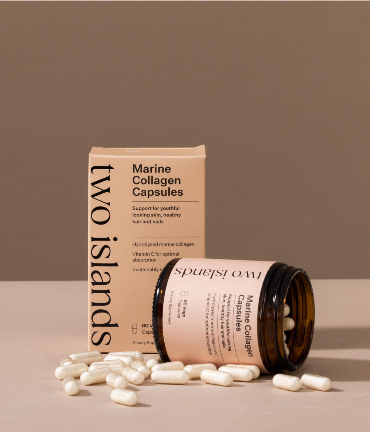 Two Islands Marine Collagen Beauty Powder contains sustainably sourced hydrolysed Marine Collagen peptides plus Vitamin C. These collagen peptides have the ability to travel through the bloodstream to various parts of the body, including the dermis – the deepest layer of our skin – and support skin hydration, elasticity and reduce the signs of aging.